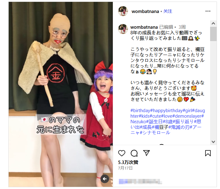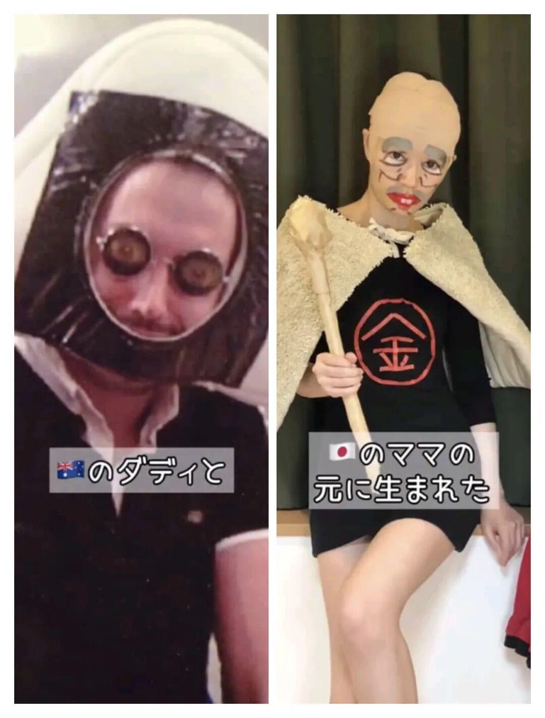 这次的出圈视频一开始就是这对夫妻的“奇装异服”:澳大利亚爸爸头上顶着饭团造型头套,戴着圆框大眼墨镜;日本妈妈舟橋则cos《ゲゲゲの鬼太郎》里的“爱哭爷爷”。