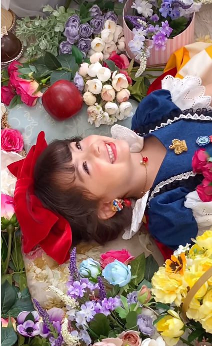 视频中接下来的一幕更是惊艳:瑠花穿着白雪公主的cosplay,被鲜花簇拥,美得像从童话里走出来一样,让人误以为是真白雪公主本尊,网友直呼“这是天赋型可爱选手”。
