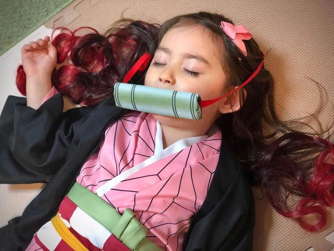 伴随着动画《鬼灭之刃》的爆红,瑠花妈妈也趁机替她Cosplay成祢豆子的角色。